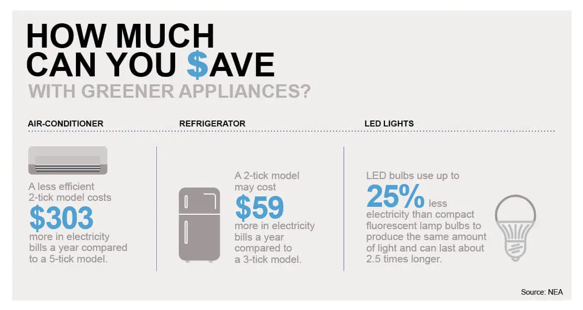 Not sure whether to use household appliances with a 4- or 5-tick or those with a 2-tick? Wondering if LED lights really make a difference? LED light bulbs and appliances with more ticks may cost more, but they are more energy-efficient and will help you save in the long run. According to the National Environment Agency (NEA), households can save $40 to $120 annually by adopting such appliances and fittings.