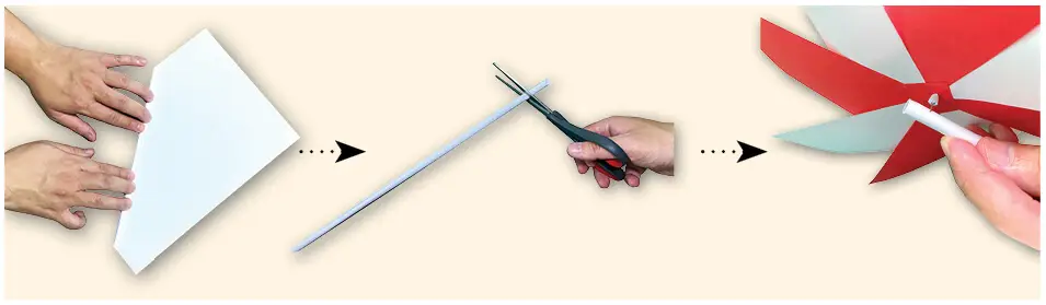 7. To make the paper straw, roll a piece of A4 paper diagonally and cut both ends to make them even. Attach the pinwheel to the paper straw with a push pin and play!