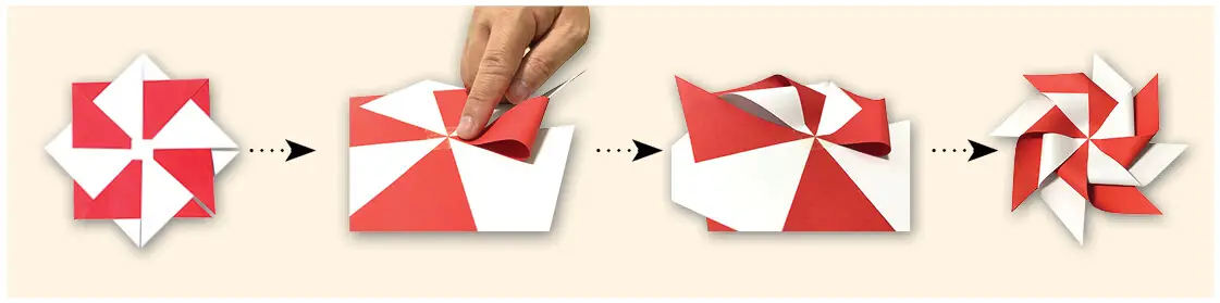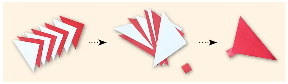 1. Fold the red and white paper diagonally and cut into triangles. You should have four red triangles and four white triangles.