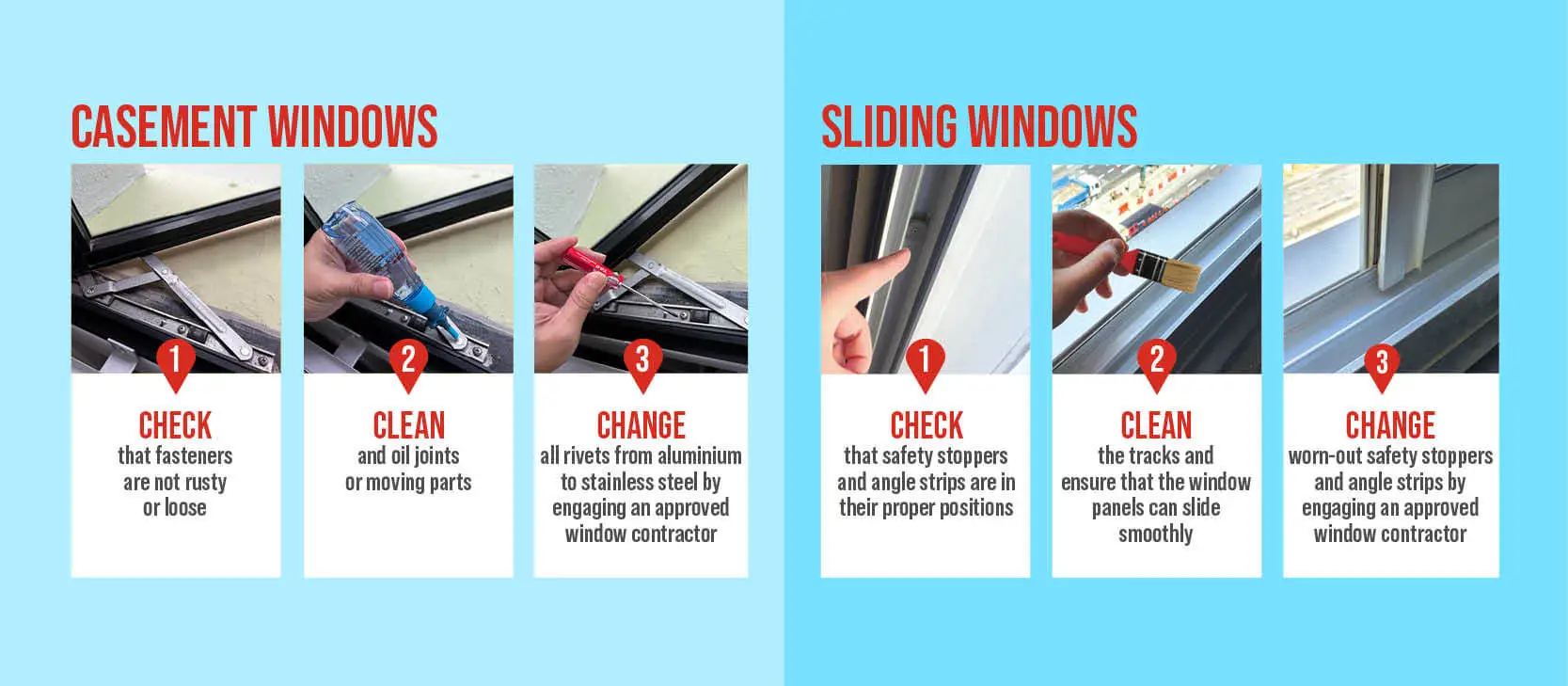 每年6月6日和12月12日被定为“窗户安全日”,提醒屋主至少每半年检查窗户一次。你应检查和清洗窗户部件或滑轨,以及聘请合格窗户承包商更换铝制铆钉或生锈部件。根据法令,如果窗户缺乏保养而坠落,屋主可面对高达1万元罚款或监禁最长一年,或两者兼施。