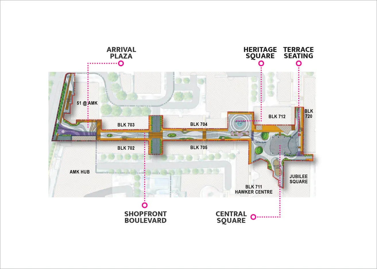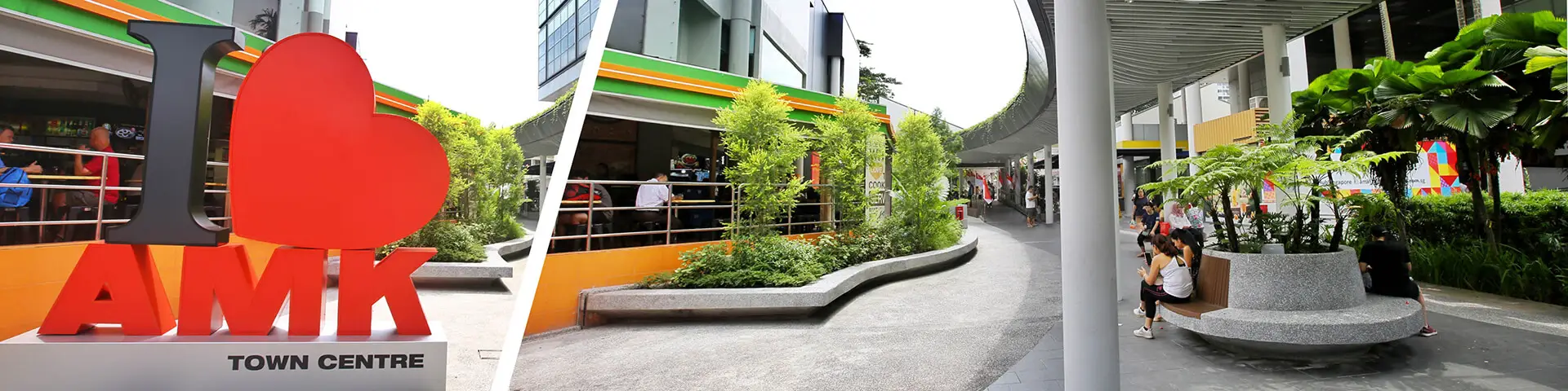 Under the Remaking Our Heartland programme, Ang Mo Kio Town Centre has been revamped with more seating, ramps, shelters and landscaping to make it more enjoyable, inclusive and accessible for residents. The first phase of the upgrade stretches from the plaza outside AMK Hub and 51@AMK, through the shopfront boulevard to the central stage, and ends near Jubilee Square.