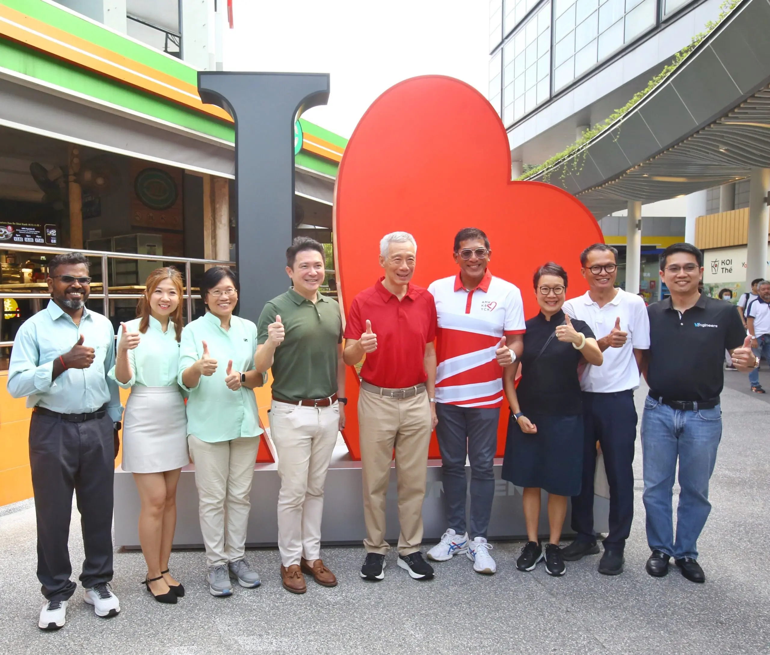Senior Minister Lee Hsien Loong (centre) with Mr Darryl David (fourth from right), Mr Henry Kwek Hian Chuan (fourth from left) and guests at the new welcome signage near 51@AMK.