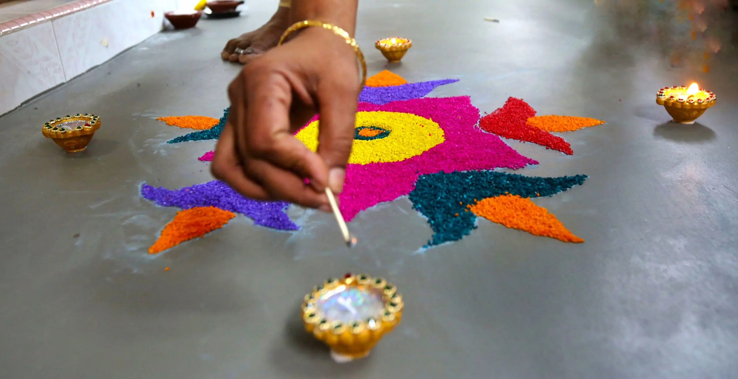 A variety of bright-coloured rice will be used to fill the rangoli to enhance the visual appeal of the artwork. To make it even more artistic, families will add some final touches by placing candles and fresh flowers to light up the design.