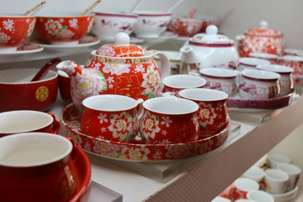 Tea sets reflect this change clearly. Colours and designs have evolved to suit modern tastes, but the meaning behind them remains the same. Dragon and phoenix still symbolise harmony, peonies continue to represent lasting love, and the Double Happiness symbol reflects union and joy. To the shop, tradition continues not through appearance, but through meaning.